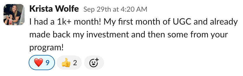 Plus, all of these badasses who earned over $2,000 as beginner UGC creators in their first few months: Kelli, Katie, Goldie, Will, Jenefer, Rebecca, Jess, Ken, Lenae, Jules, Mary, Hannah, Taylor, Emma, Elizabeth, Chelsea, Erica, and so many more!!