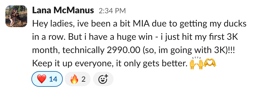 "Seriously feels like I’m living in a fairy tale rn. Getting to 'work' by taking little videos is crazy. In the best way. Thanks for pushing me and teaching me and just being there for support. Soooo happy to be in this vibration. Currently at $3k/ month for the next three months and it feels soooo amazing!! That’s well more than my bills. And it can literally only go up from here!"