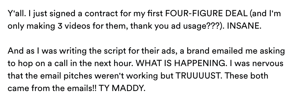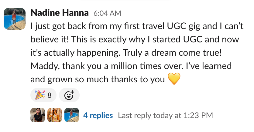 "Maddy is AMAZING!!!! She’s helped me quit both my jobs to pursue UGC full-time and I’m making more with UGC than I ever was with my other jobs. She’s super knowledgeable and hands-on. Take this as your sign to go for it.."